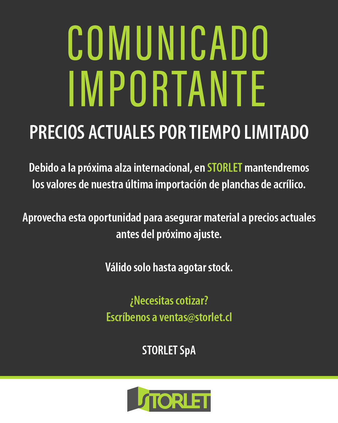 Para ventas, cotizaciones y stock de productos, comunicarse a: ventas@storlet.cl, kperez@storlet.cl